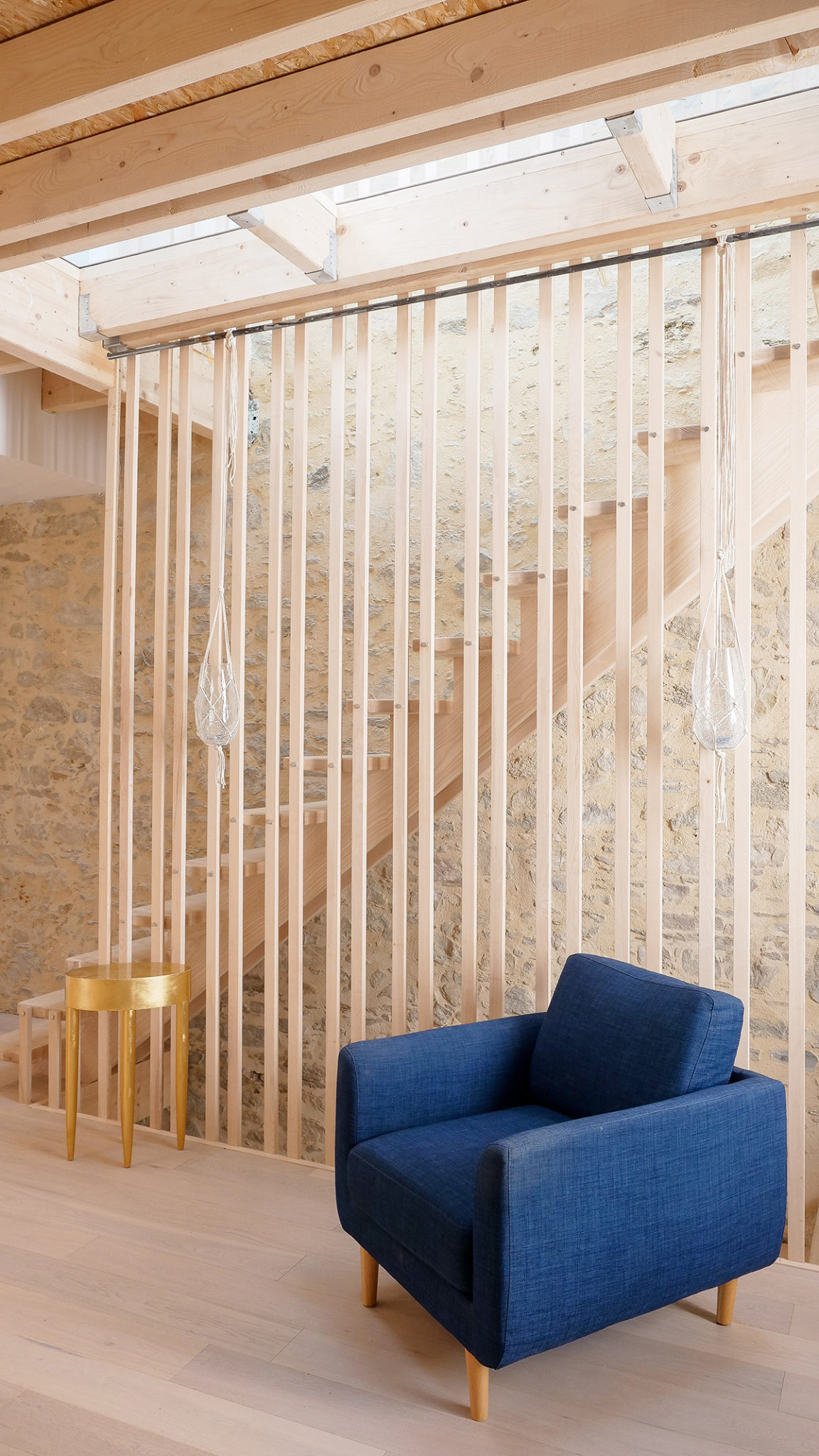 Pour atteindre cet objectif, la rénovation de la maison est réalisée quasi exclusivement en filière sèche. L’ensemble des planchers existants ayant été démolis pour permettre la re-création de planchers bois en épicéa massif et lamellé collé assurant une nouvelle ceinture structurelle au bâti. L’ajout de tirants aciers en façade rue, avec clés de tirants dessinées de façon contemporaine à partir des armoiries de la famille, permettent désormais de resolidariser la façade avec le reste de la maison.