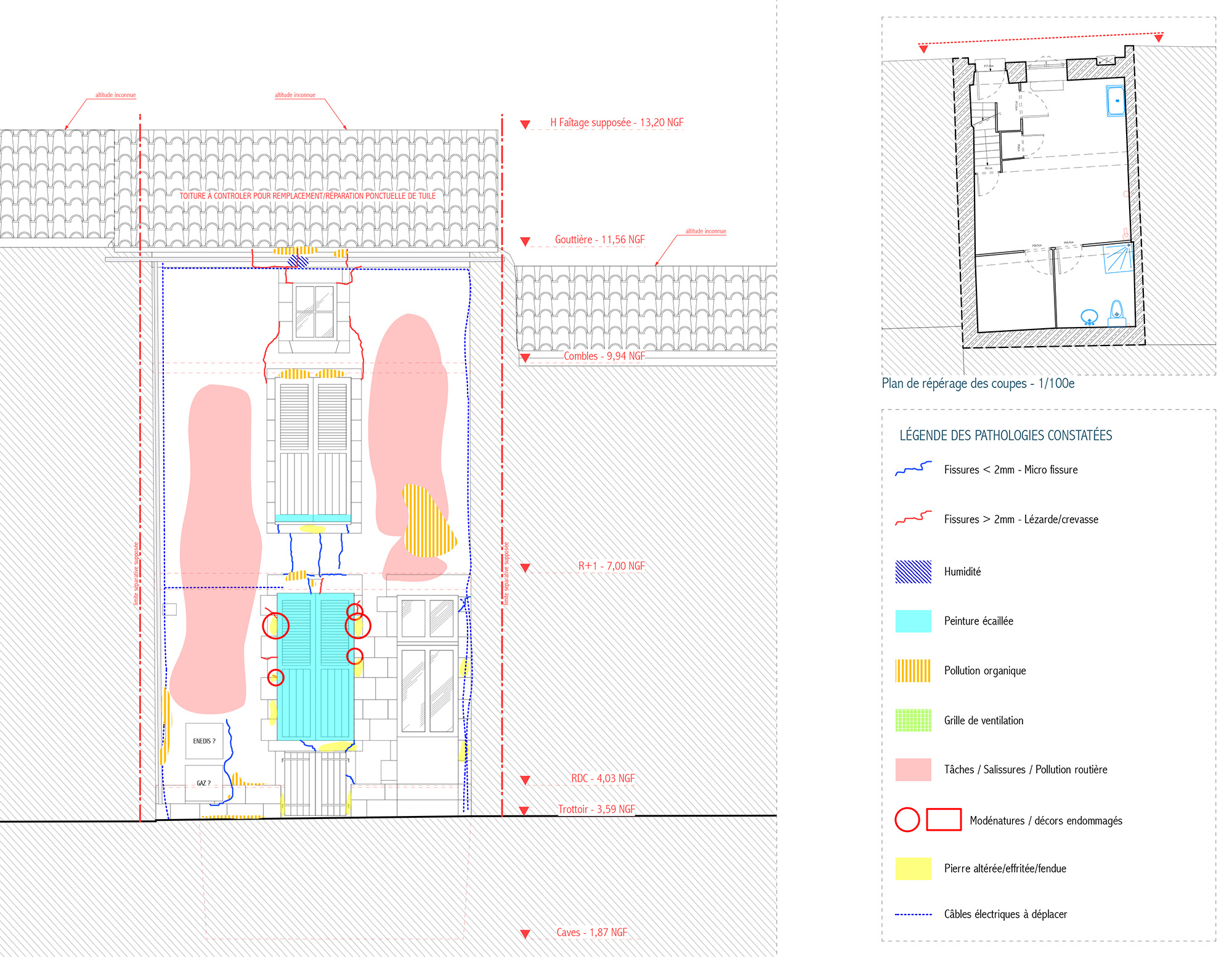 Les études préliminaires effectuées sur site ont révélé la nécessité de prévoir avant toute phase de travaux une consolidation structurelle de la maison. Afin de permettre cette restructuration lourde, nous avons choisi de proposer au maître d’ouvrage un projet visant l’essentiel, dans lequel toutes les dispositions proposées seraient à la fois structurelles et esthétiques pour maximiser les économies.