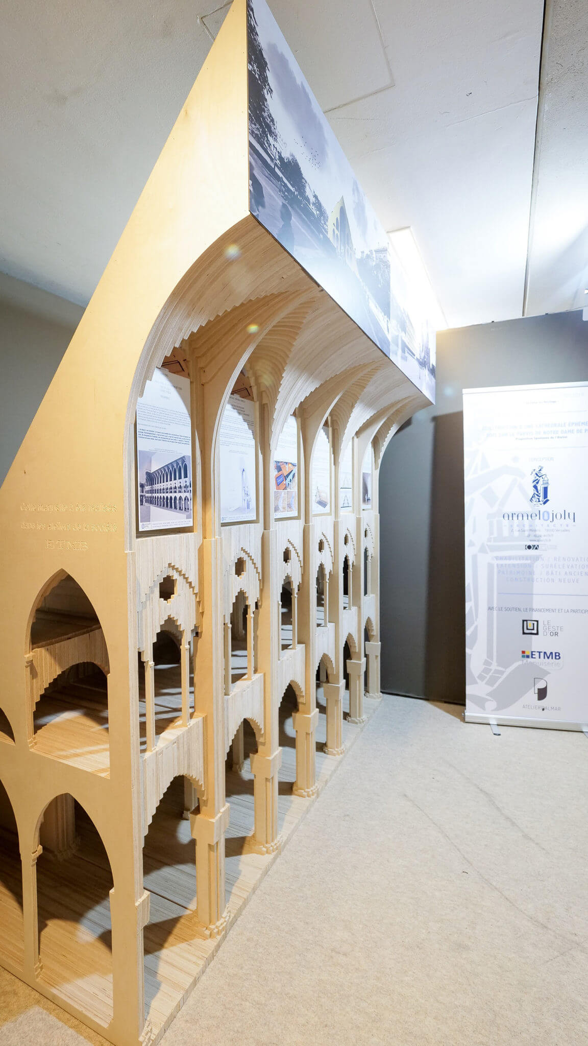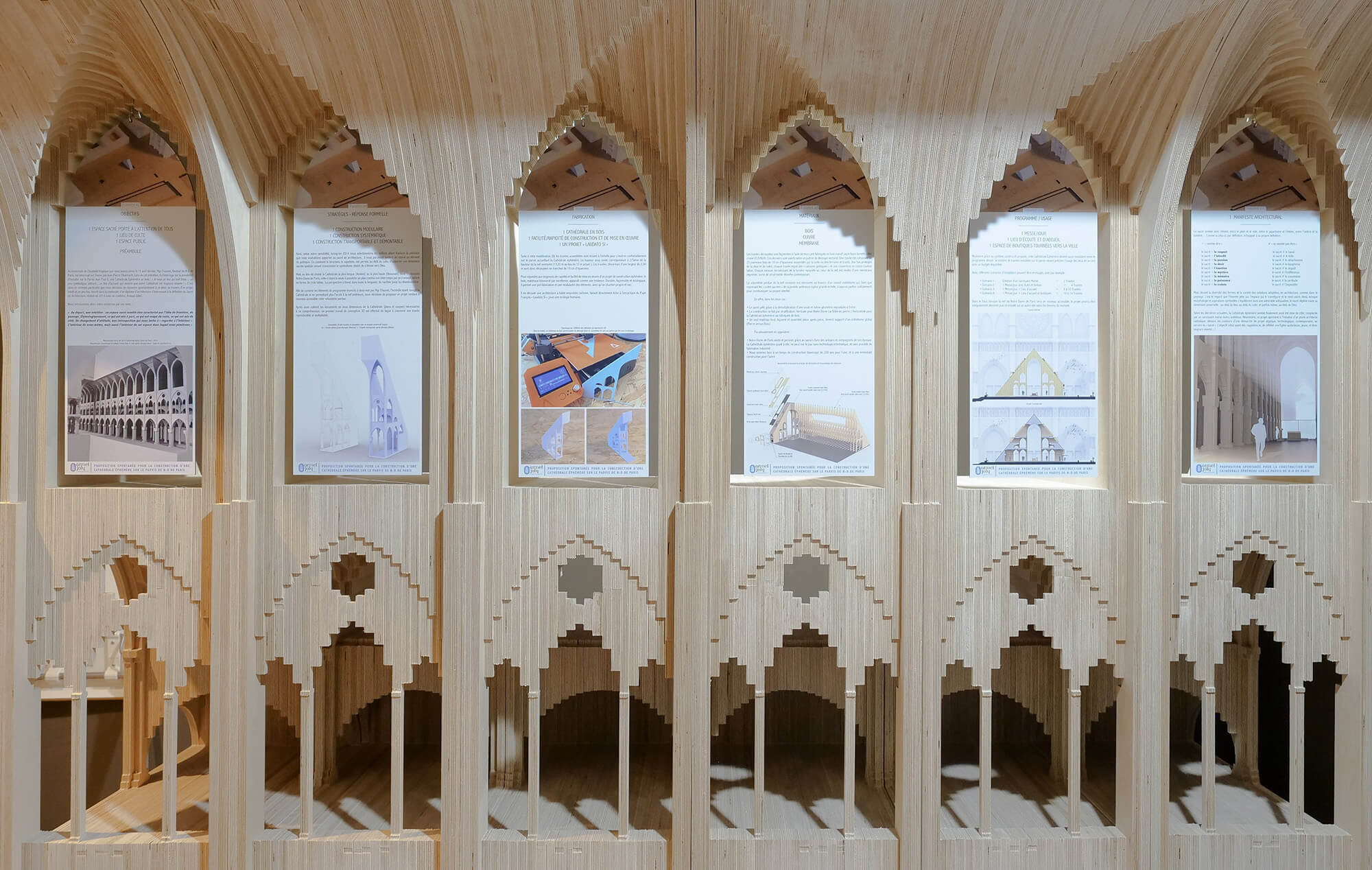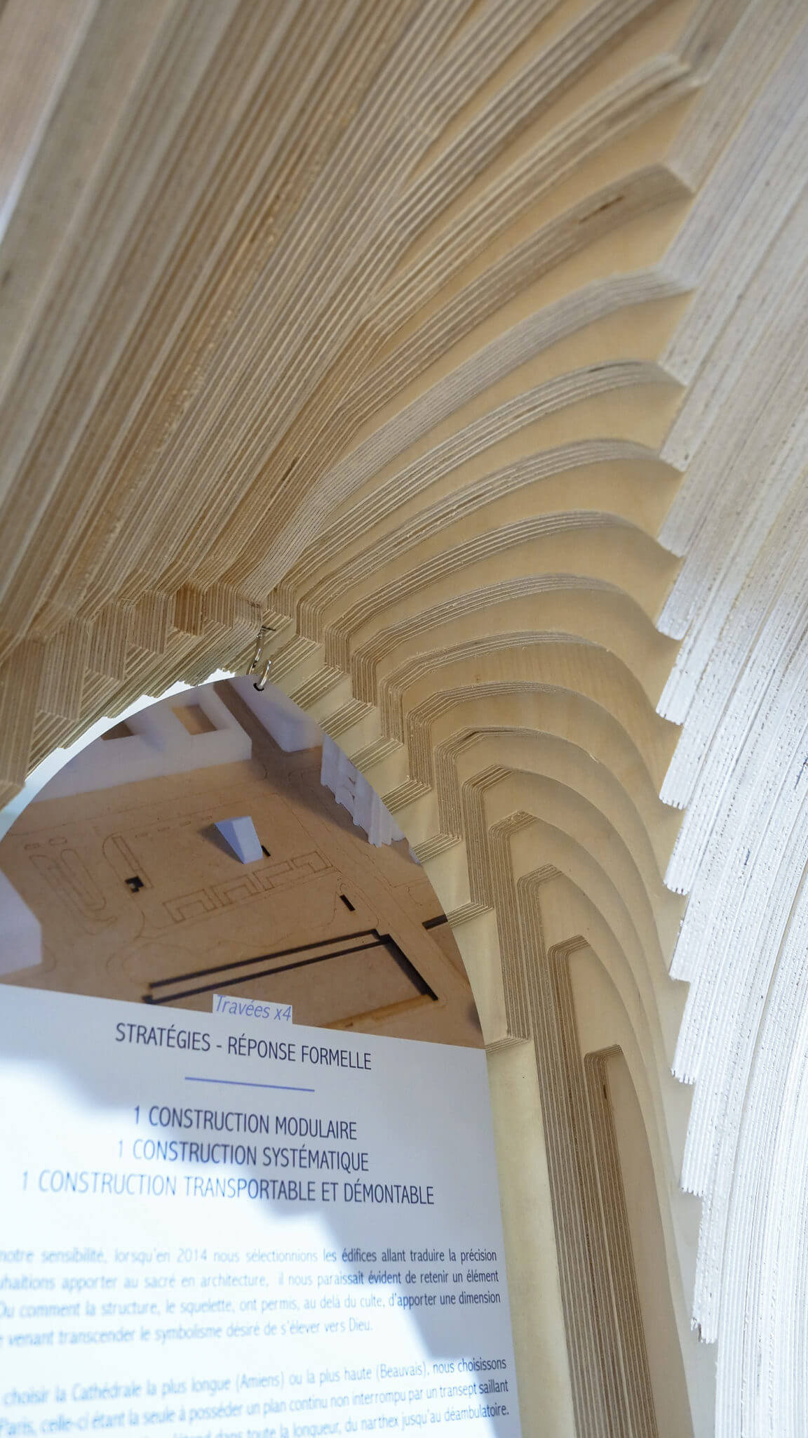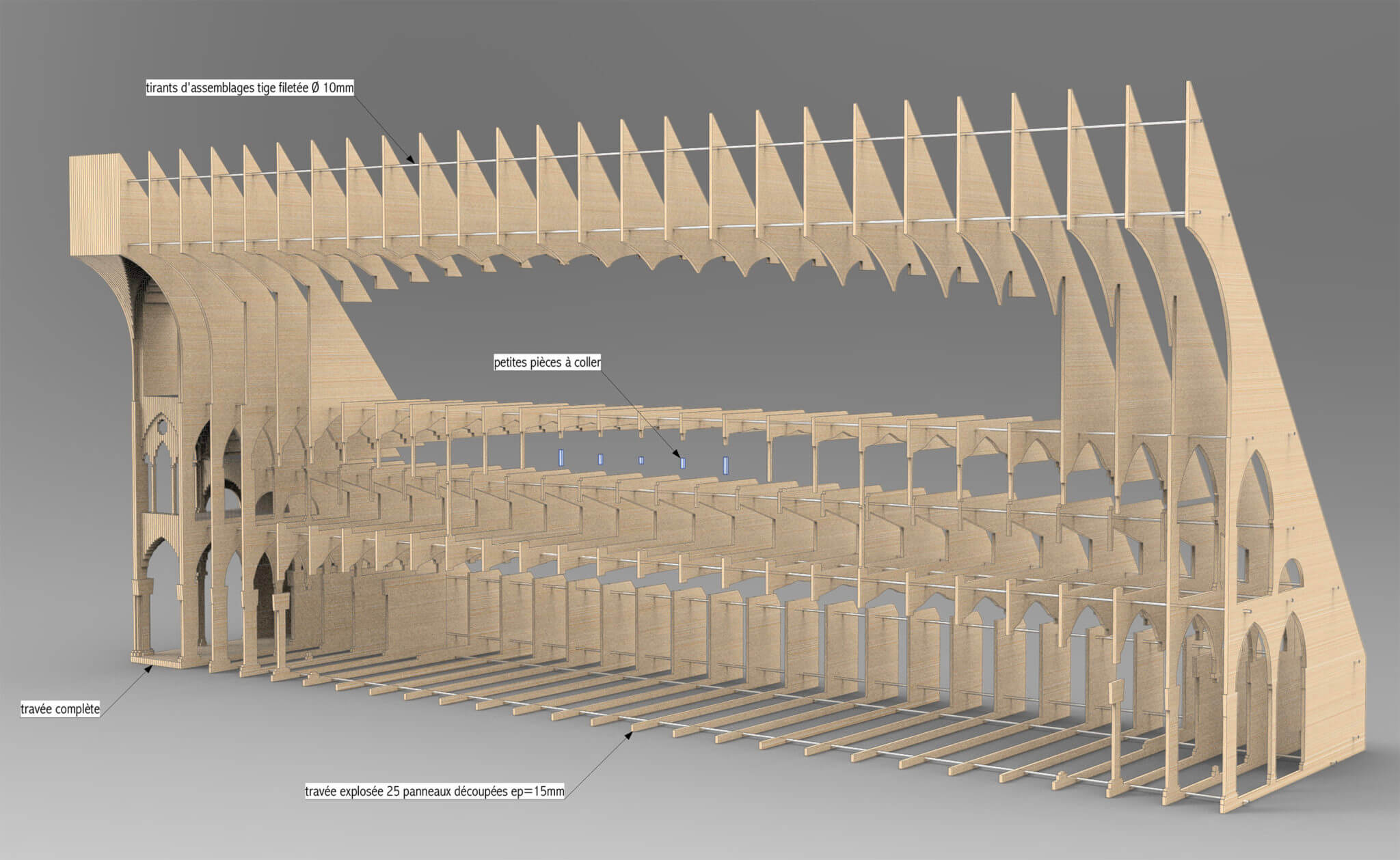 Grâce au soutien et au financement du Geste d’Or, 6 travées ont été reproduites, fabriquées par l’entreprise de menuiserie #ETMB, selon le modèle constructif que nous proposions pour la Cathédrale Éphémère, à savoir une ré-interprétation contemporaine structurel de la travée gothique, par stratification transversale en bois massif (ici Contreplaqué bouleau 15mm épaisseur).
