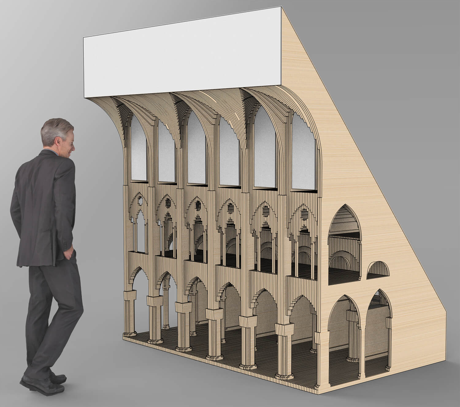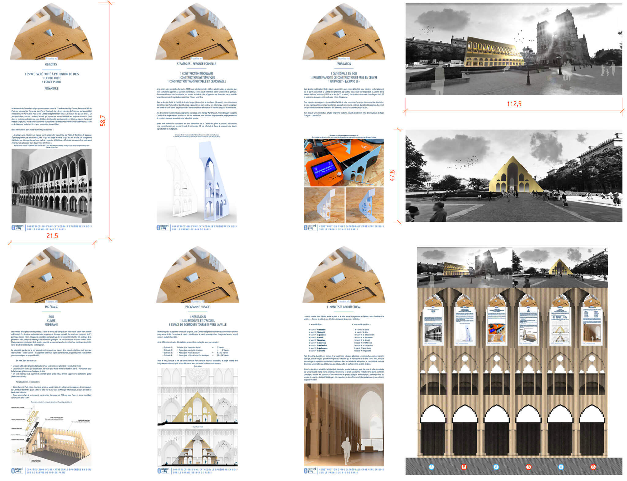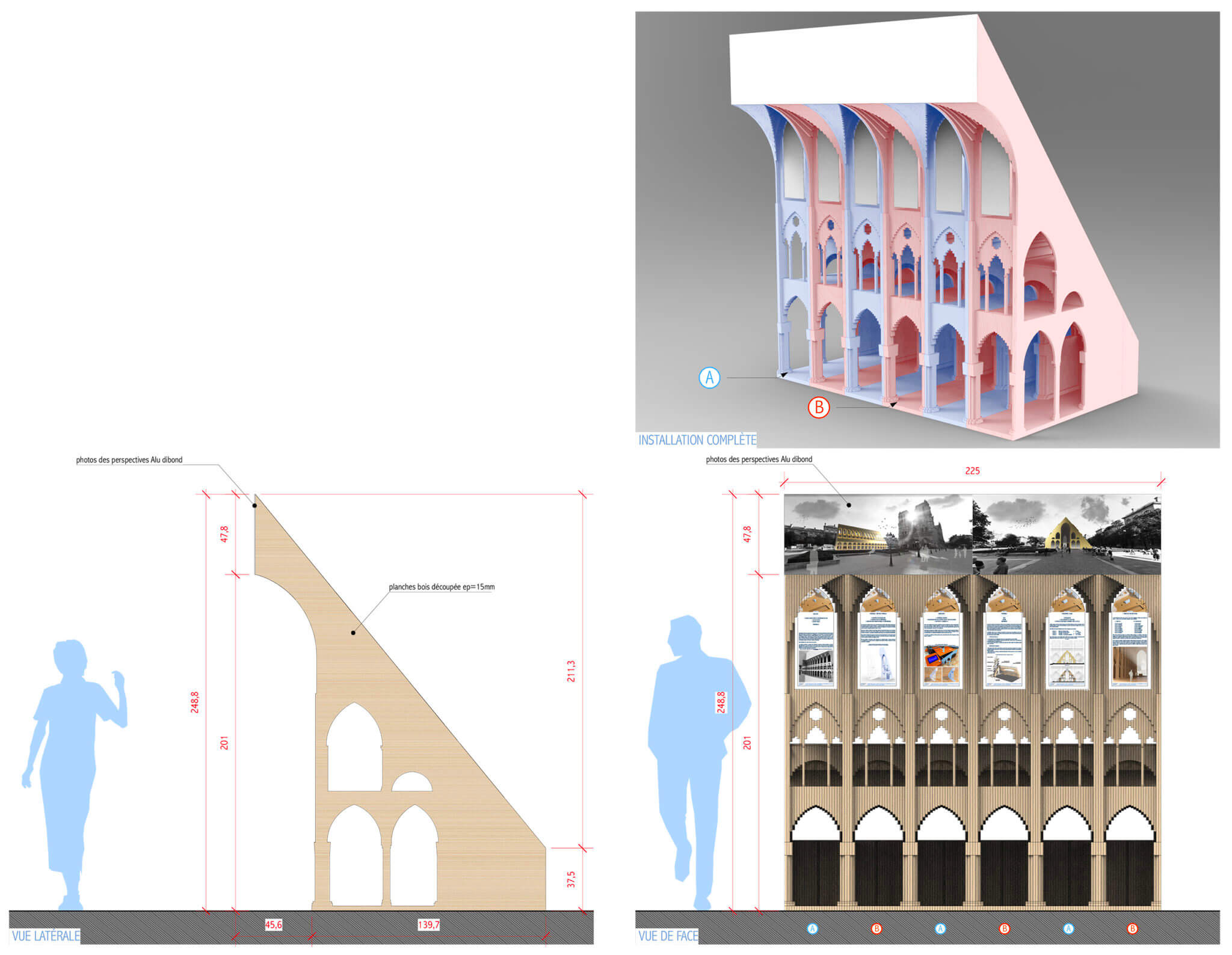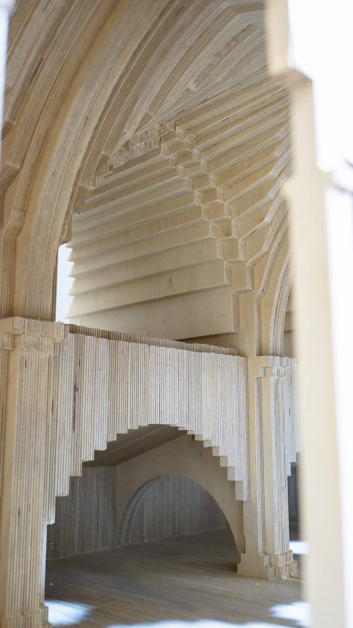 Grâce au soutien et au financement du Geste d’Or, 6 travées ont été reproduites, fabriquées par l’entreprise de menuiserie #ETMB, selon le modèle constructif que nous proposions pour la Cathédrale Éphémère, à savoir une ré-interprétation contemporaine structurel de la travée gothique, par stratification transversale en bois massif (ici Contreplaqué bouleau 15mm épaisseur).