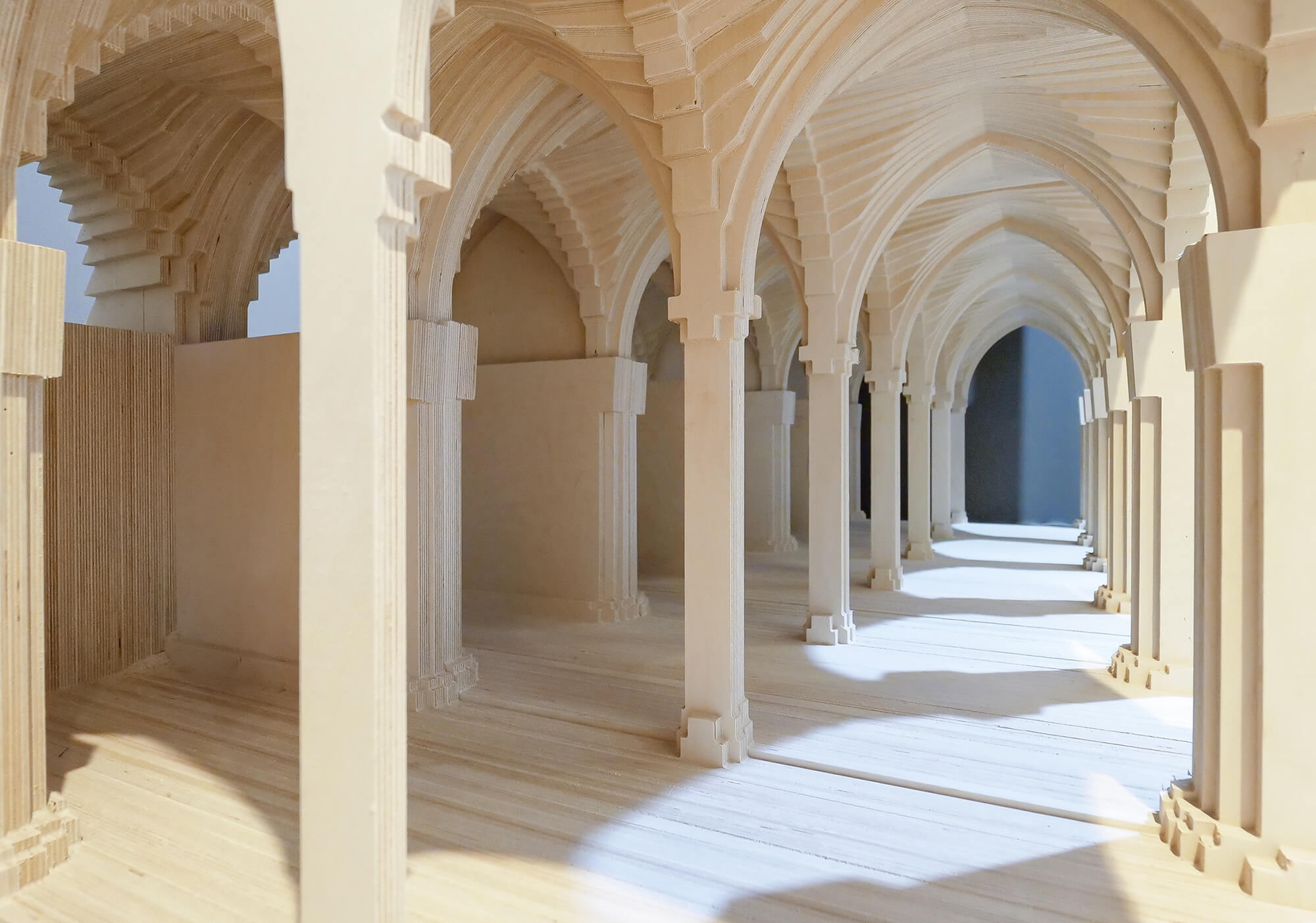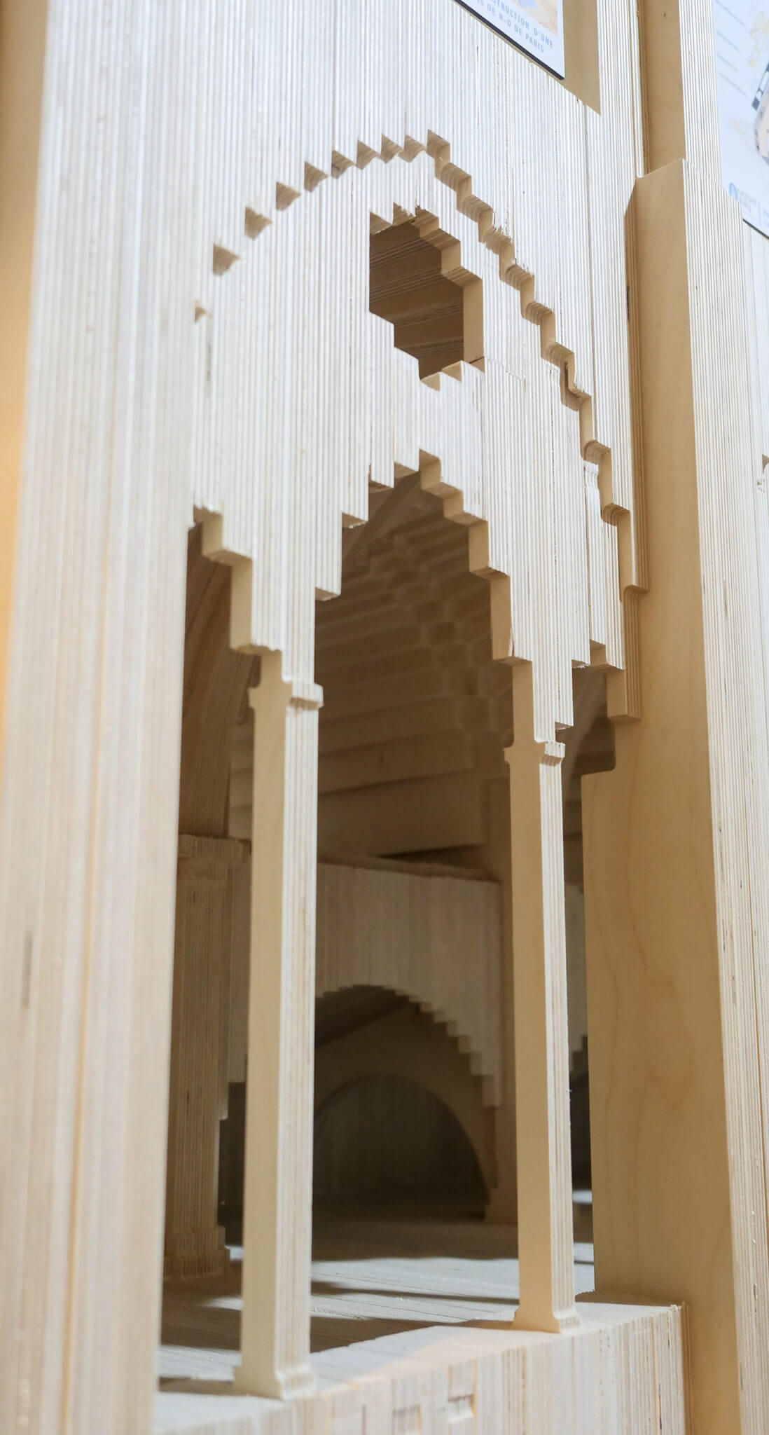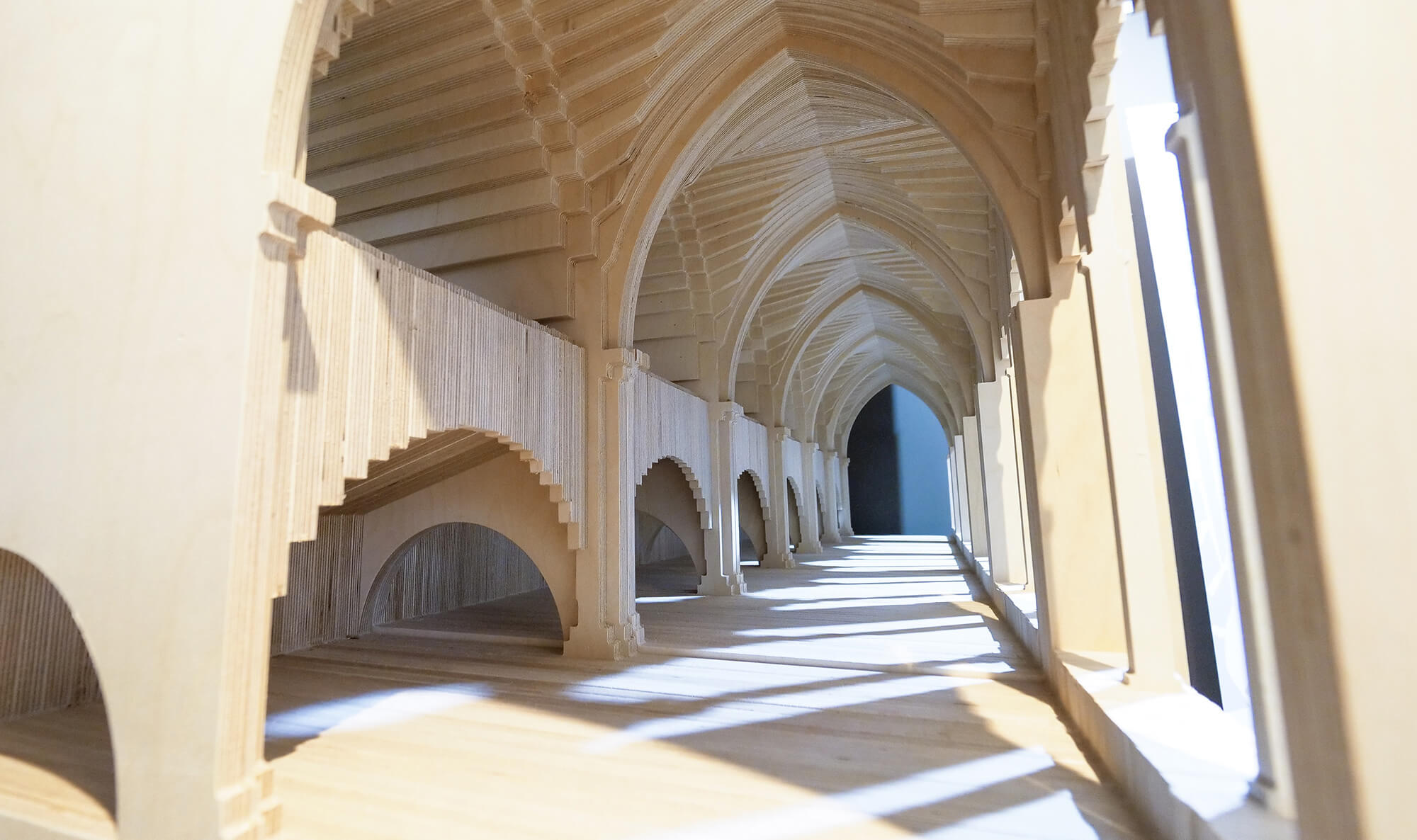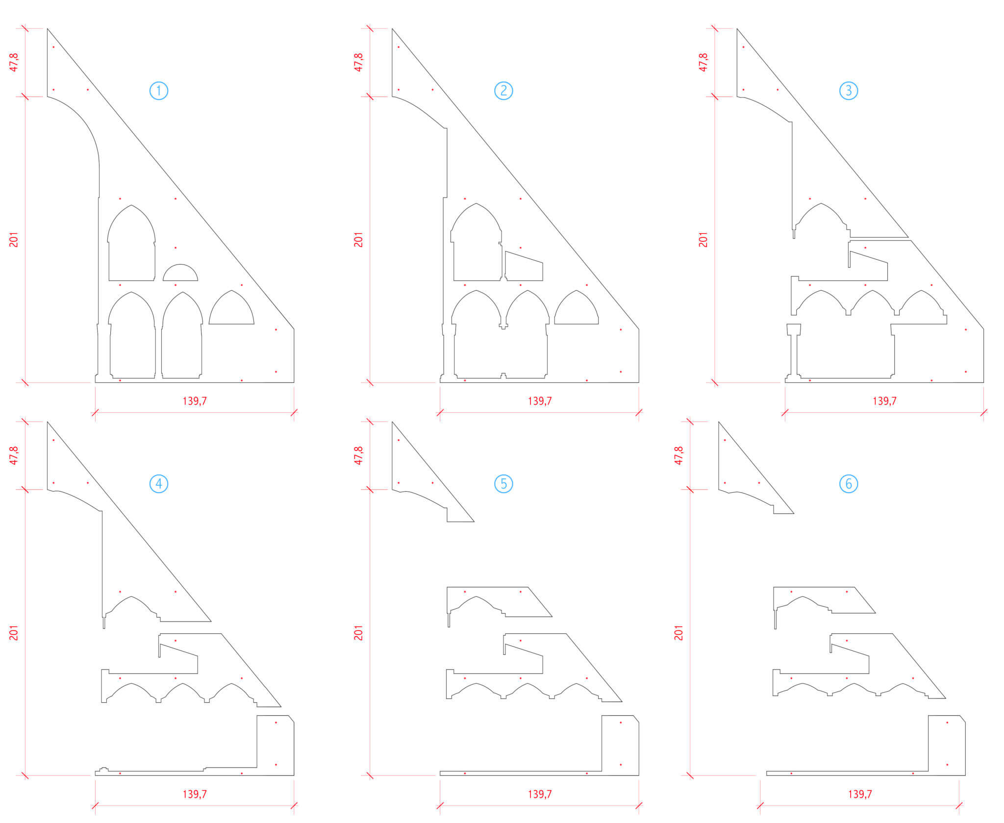 Grâce au soutien et au financement du Geste d’Or, 6 travées ont été reproduites, fabriquées par l’entreprise de menuiserie #ETMB, selon le modèle constructif que nous proposions pour la Cathédrale Éphémère, à savoir une ré-interprétation contemporaine structurel de la travée gothique, par stratification transversale en bois massif (ici Contreplaqué bouleau 15mm épaisseur).