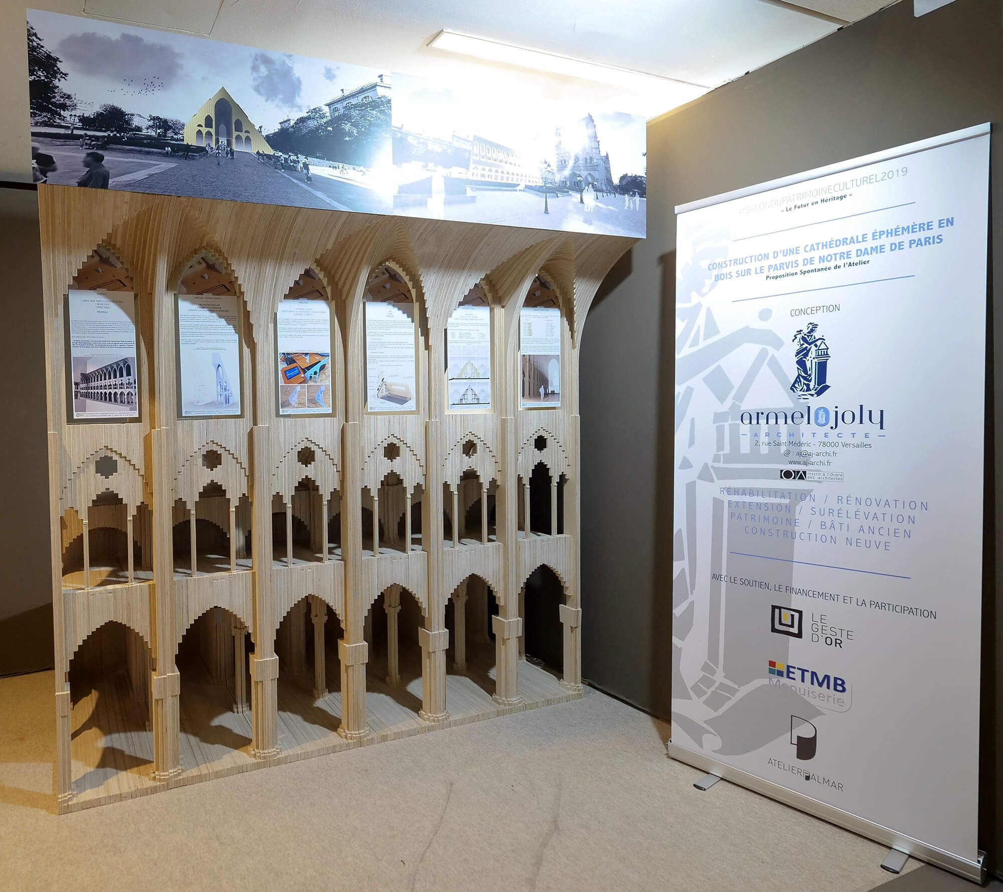Suite à l’incendie de Notre Dame de Paris et suite à notre proposition spontanée pour la construction d’une Cathédrale Éphémère sur le Parvis Jean Paul II, celle-ci a été reproduite en modèle réduit pour une exposition qui s’est déroulée au Salon International du Patrimoine Culturel du 24 au 27 octobre 2019.